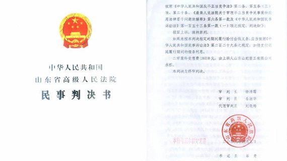 最高人民法院于2009年1月4日依法駁回再審人秦皇島市山海關(guān)起重機械廠破產(chǎn)清算組的再審申請,認定我公司關(guān)于“山起”商標的轉(zhuǎn)讓合同合法有效,維護我公司的合法權(quán)益。